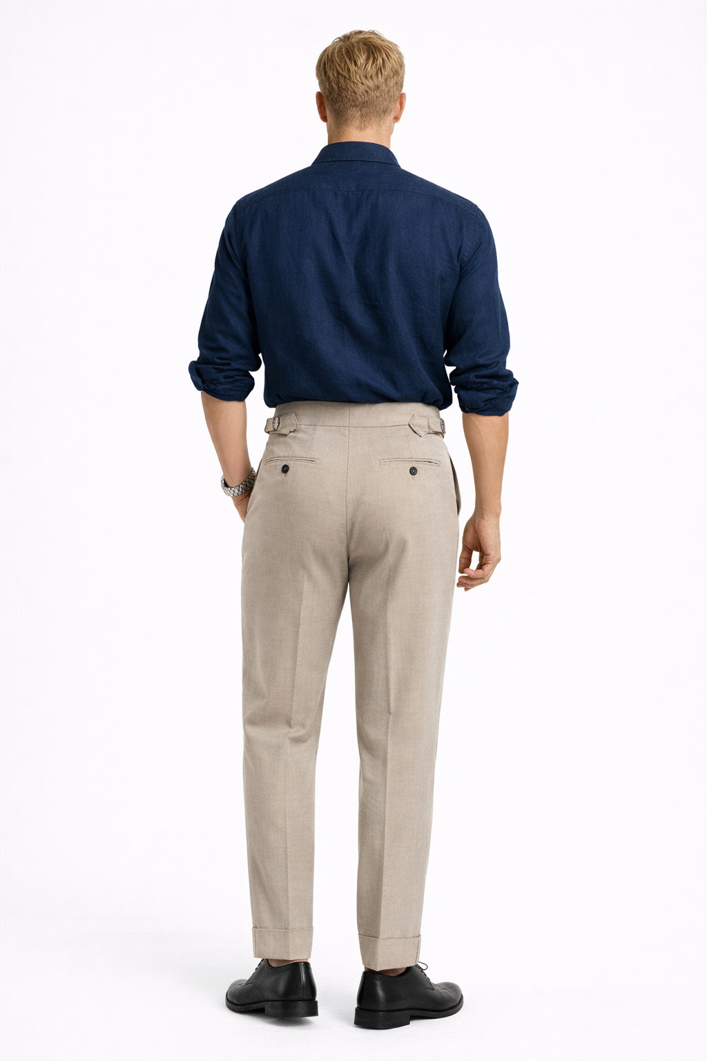 Tailored for the man who dresses with intent. A signature Paris-style side buckle fastening — a detail borrowed from classic bespoke tailoring — paired with a clean front pleat and a slim silhouette that sits high on the waist and falls long. The grey khaki tone keeps it versatile: wear it to the office, dress it down on weekends, or build a full suit look around it.